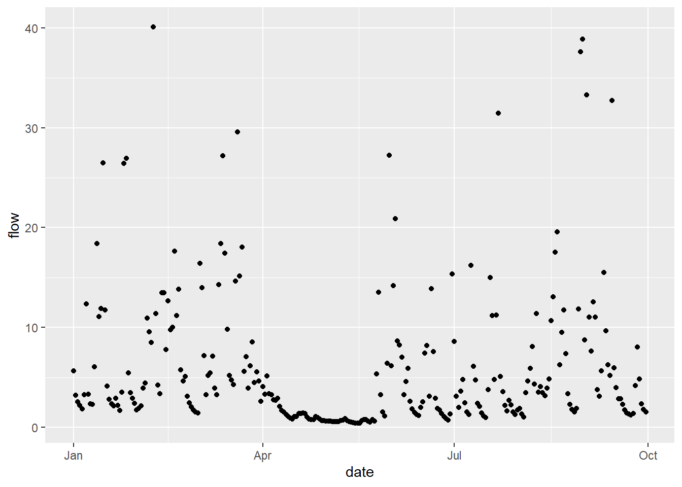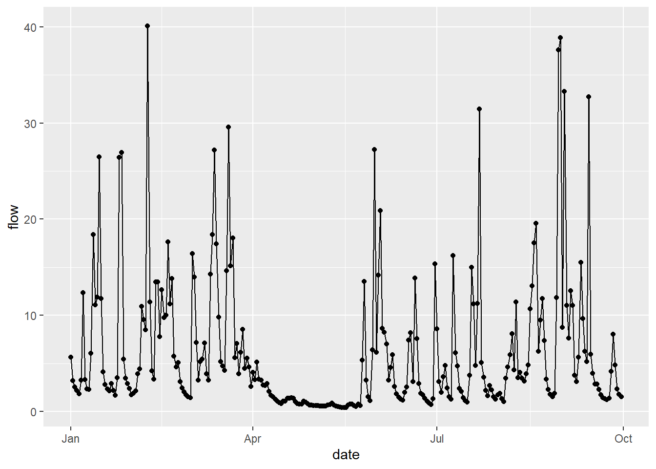 With the data frame defined, we now need to specify which columns of date we wish to plot. The code below uses the function mapping=aes()to do so, where the date variable (within the df object) is assigned to the x-axis x=date and the flow rate variable is assigned to the y-axis y=flow using their column names: