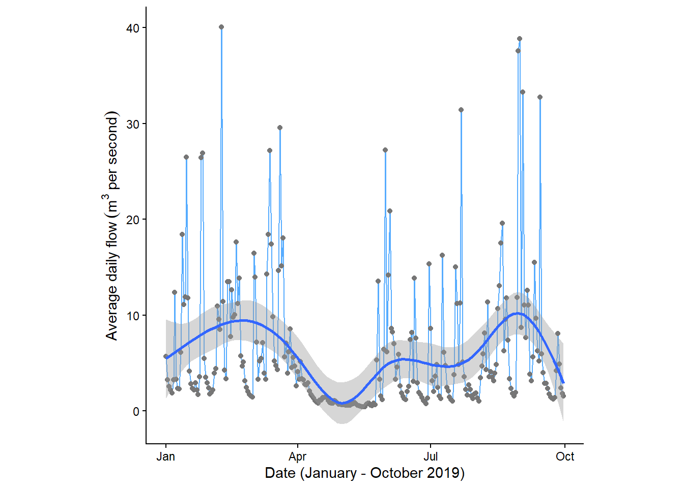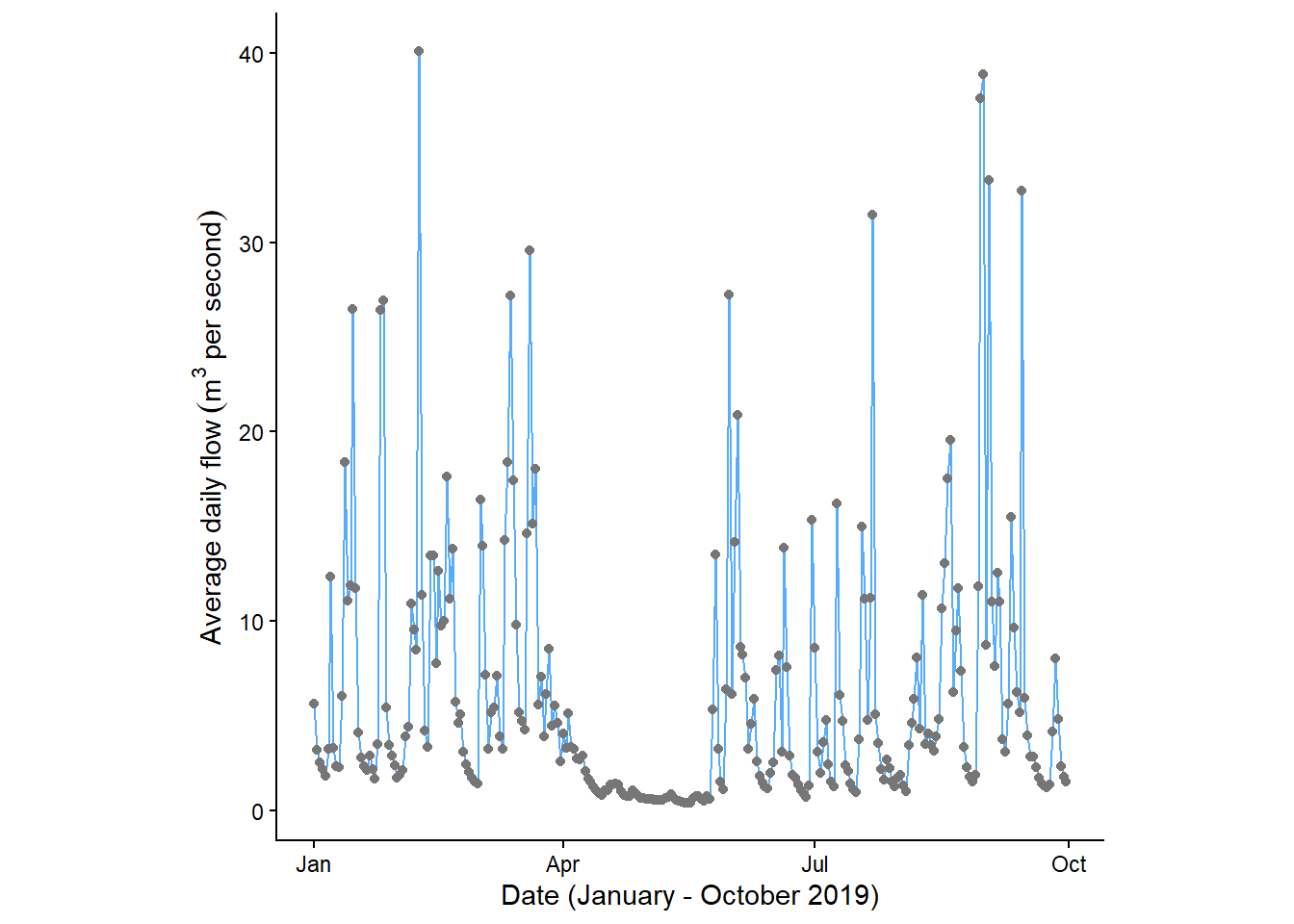 labs(x = "Date (January - October 2019)", y = bquote('Average daily flow'~(m^3~'per second')))