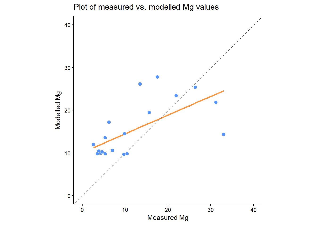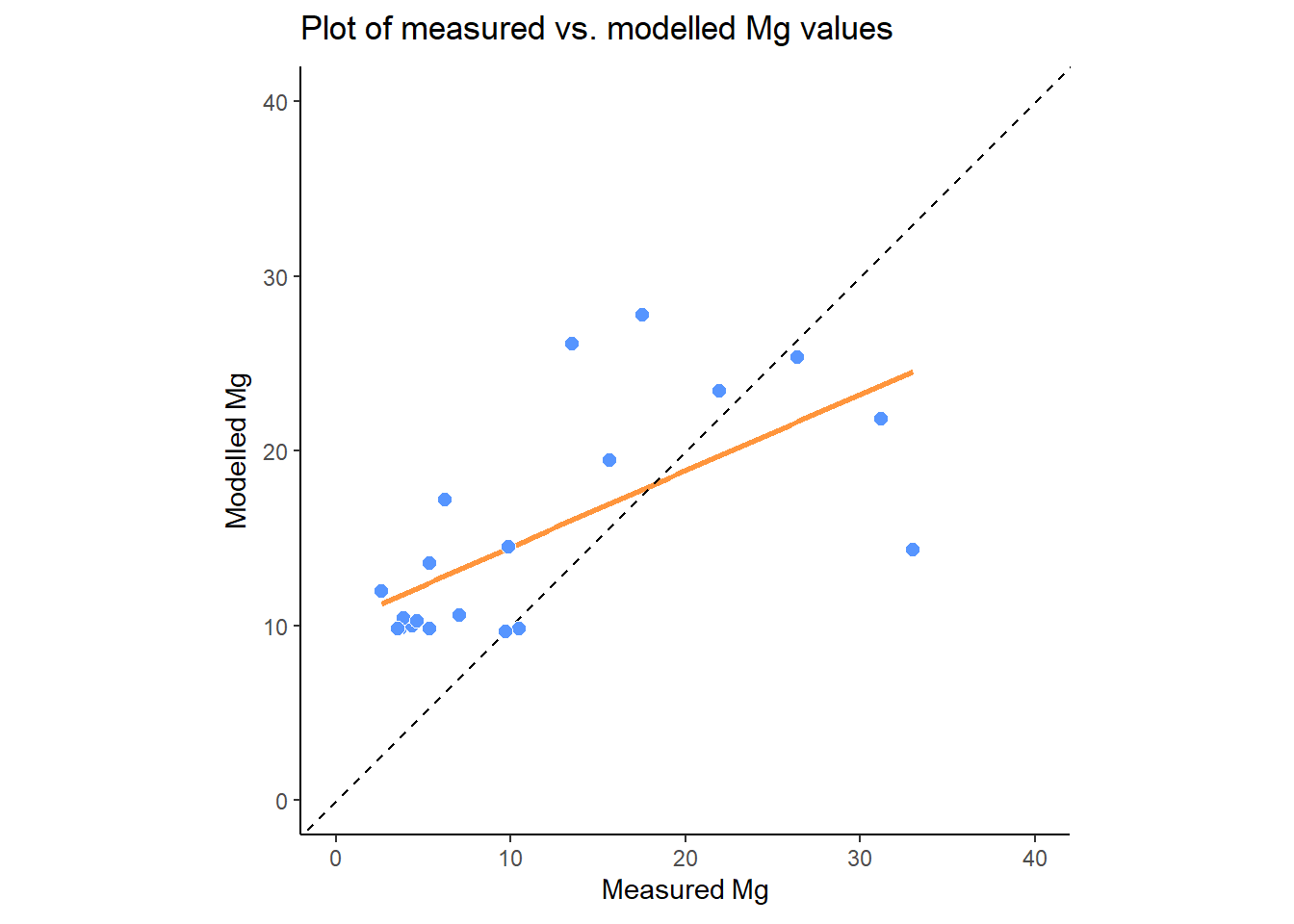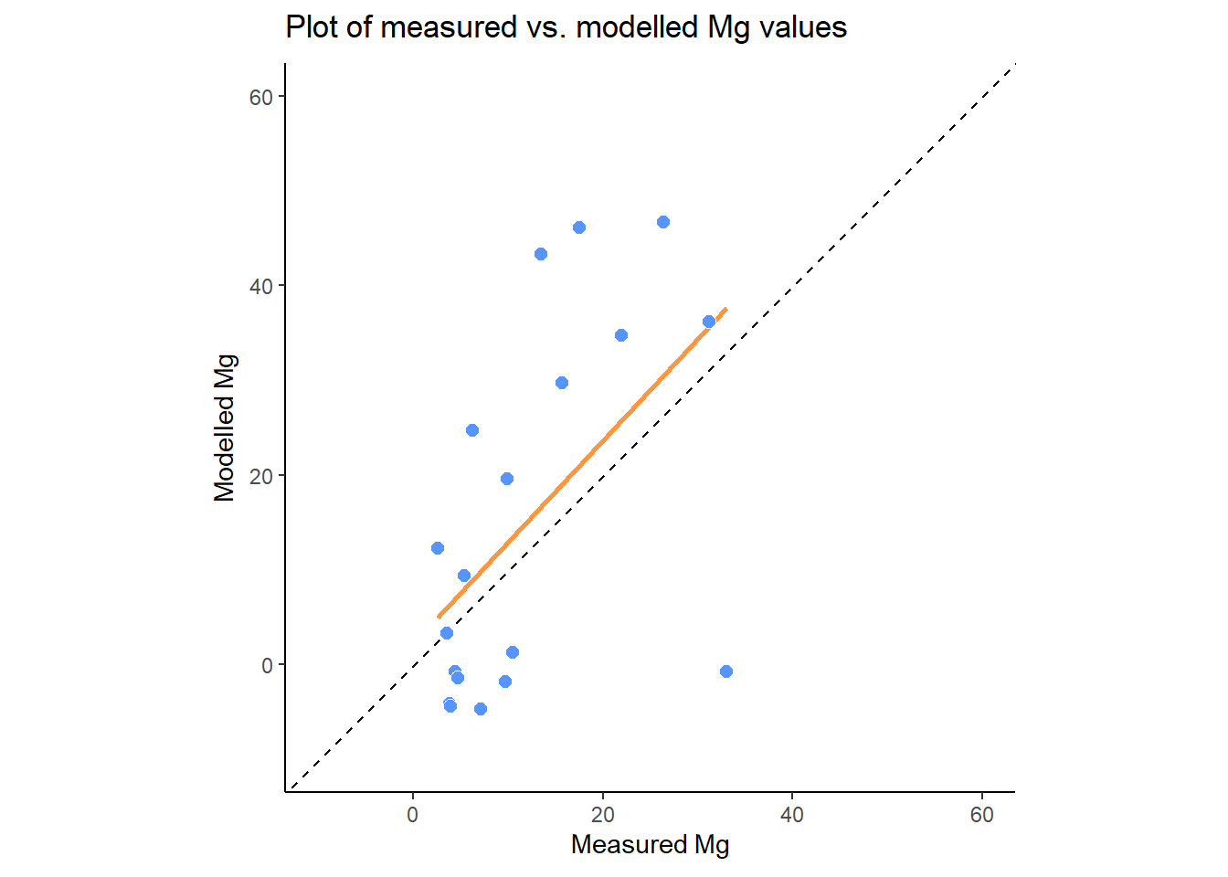 You could also assess this relationship statistically, but be careful to calculate \(R^2\) correctly (\(1-\frac{RSS}{TSS}\)), rather than lm(formula = Mg ~ predicted_Mg....