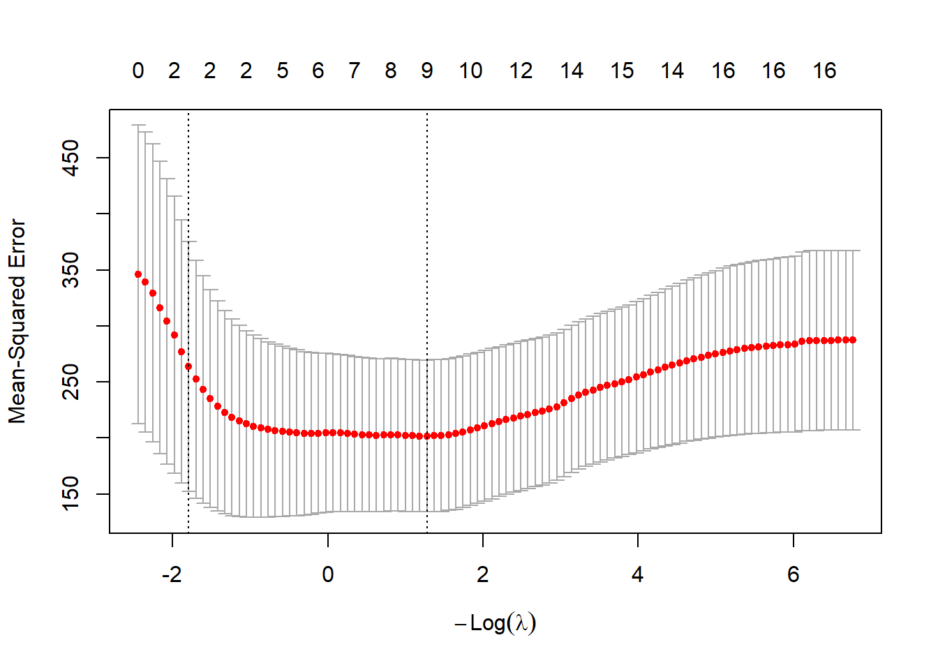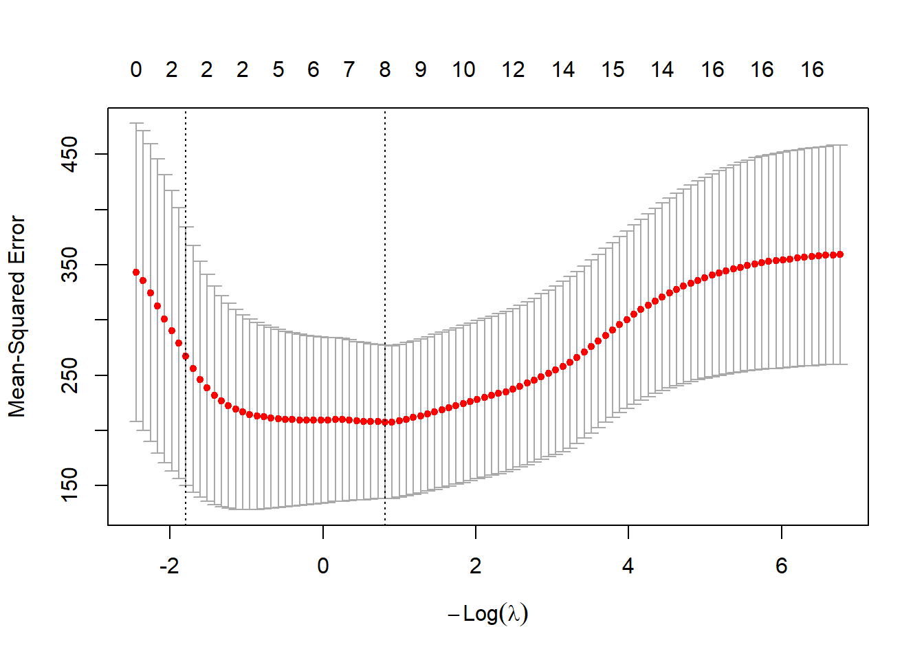 \(λ_{min}\) is therefore the “best” model, based upon the mean cross-validated error. However, a user might prefer to select \(λ_{1se}\). As this has a larger penalty value (λ), this will guard better against overfitting, while typically resulting in fewer independent variables.