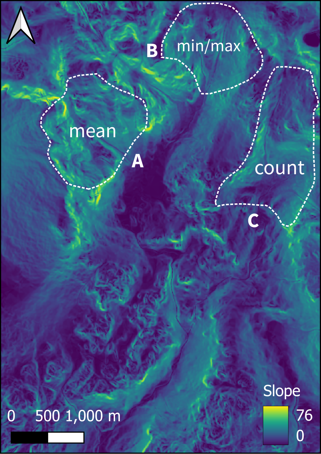 Figure 5: Visual example of the extract function. In this example, our raster layer is the slope of the terrain in the Eskdale catchment, studied in Week 9, with values ranging from 0° (flat) to 76° (very steep). Our vector layer is a series of three \(Polygons\), covering three upland locations (other valid vector types include \(Points\) and \(Lines\)). Here, the extract function would return the average and minimum-maximum slope for \(Polygons\) \(A\) and \(B\) respectively, and the count (number of raster cells) for \(Polygon\) \(C\).