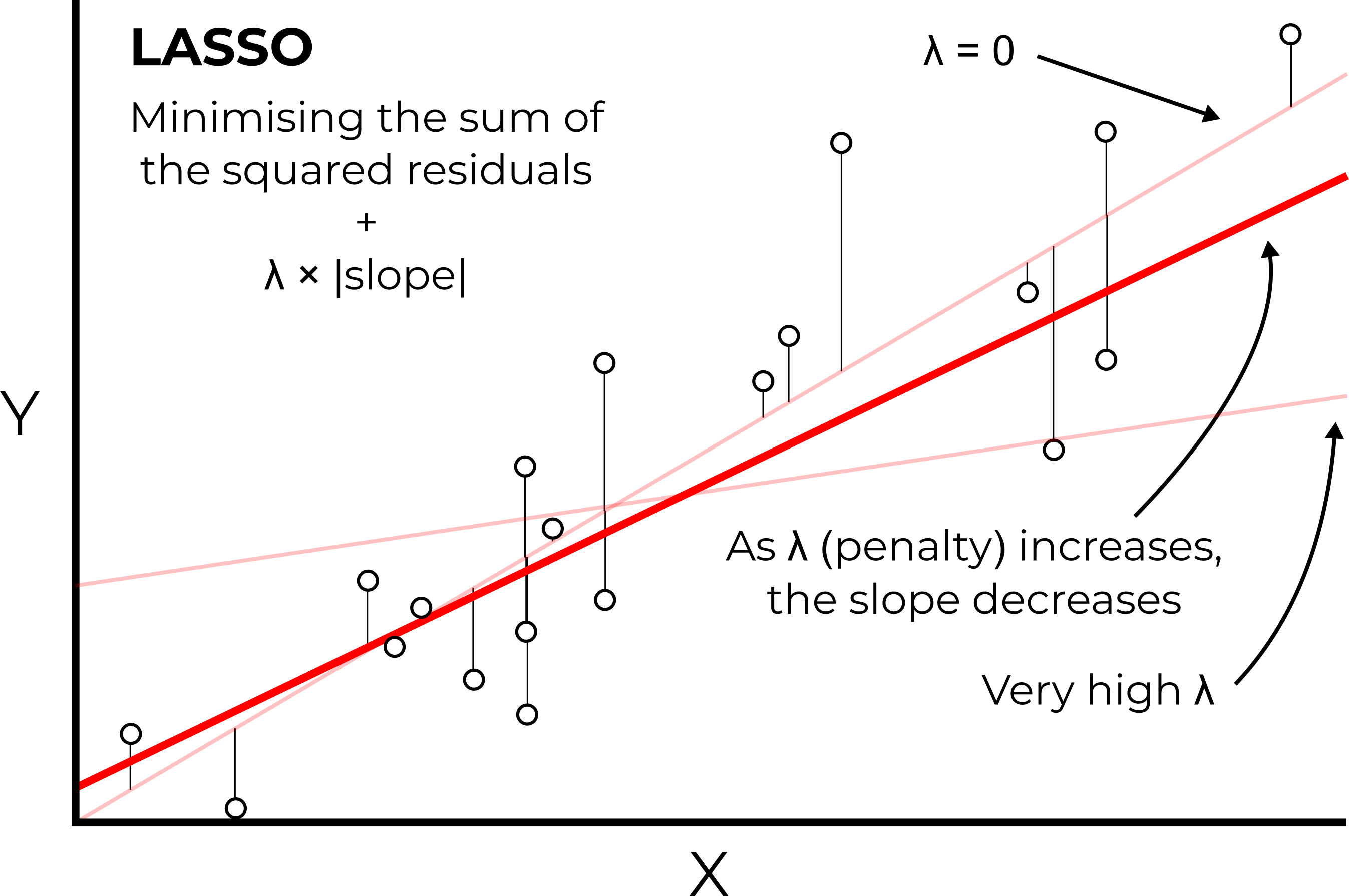If this has worked as expected, your plots and final models should have changed each time. Sometimes this difference might be quite subtle, but occasionally you will obtain a very different result. As discussed above, this is due to the random splitting of the data during cross-validation. Our relatively small dataset is quite sensitive to this split, whereas we might expect to see less sensitive behaviour for datasets consisting of hundreds or thousands of measurements, or where there are high magnitude or unambigious links between the dependent and independent variables.