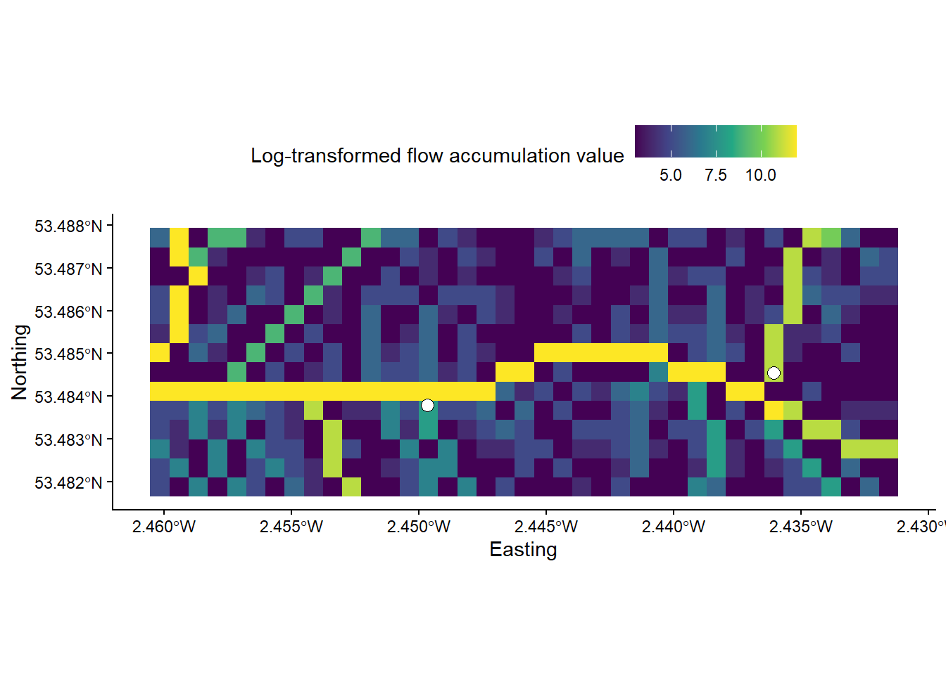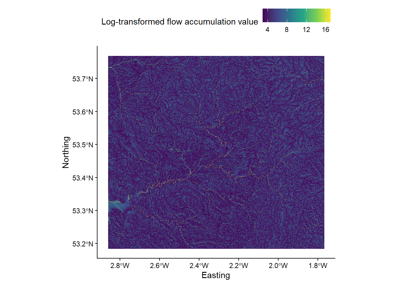 labs(fill = "Log-transformed flow accumulation value", x = "Easting", y = "Northing") +