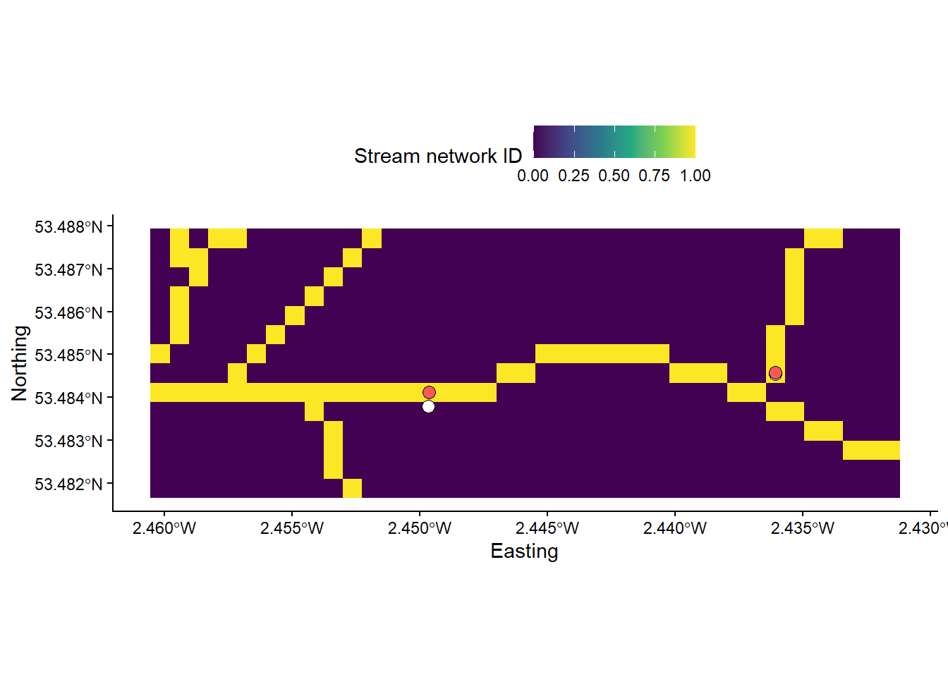 Below is a figure showing the flow accumulation raster (mersey_dem_flow_accumulation.tif) and the EA monitoring stations (mersey_EA_sites.shp). Here, we’re using the raster package to load the raster data, and the st_read() function from the sf package (Simple Features) to load the vector data.
